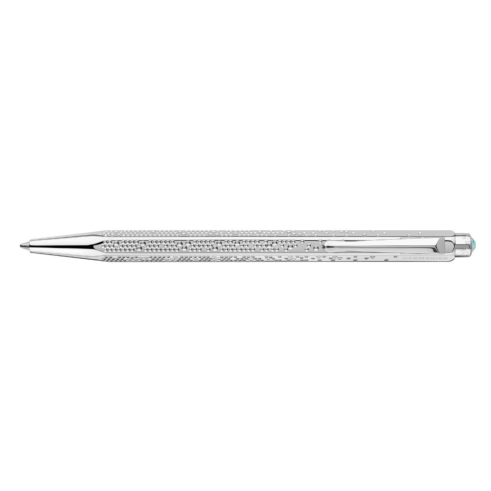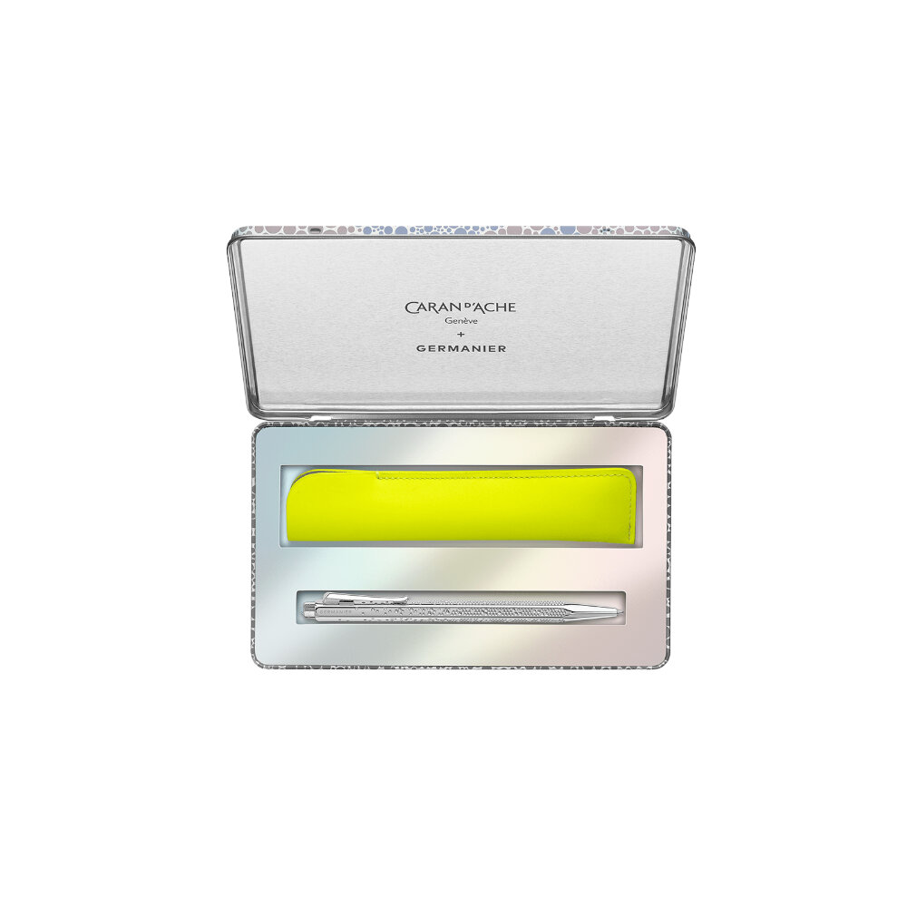Δύο στυλό 849 σε αποχρώσεις νέον με μοτίβα εμπνευσμένα από χάντρες διαθέτουν περήφανα το λογότυπο GERMANIER.